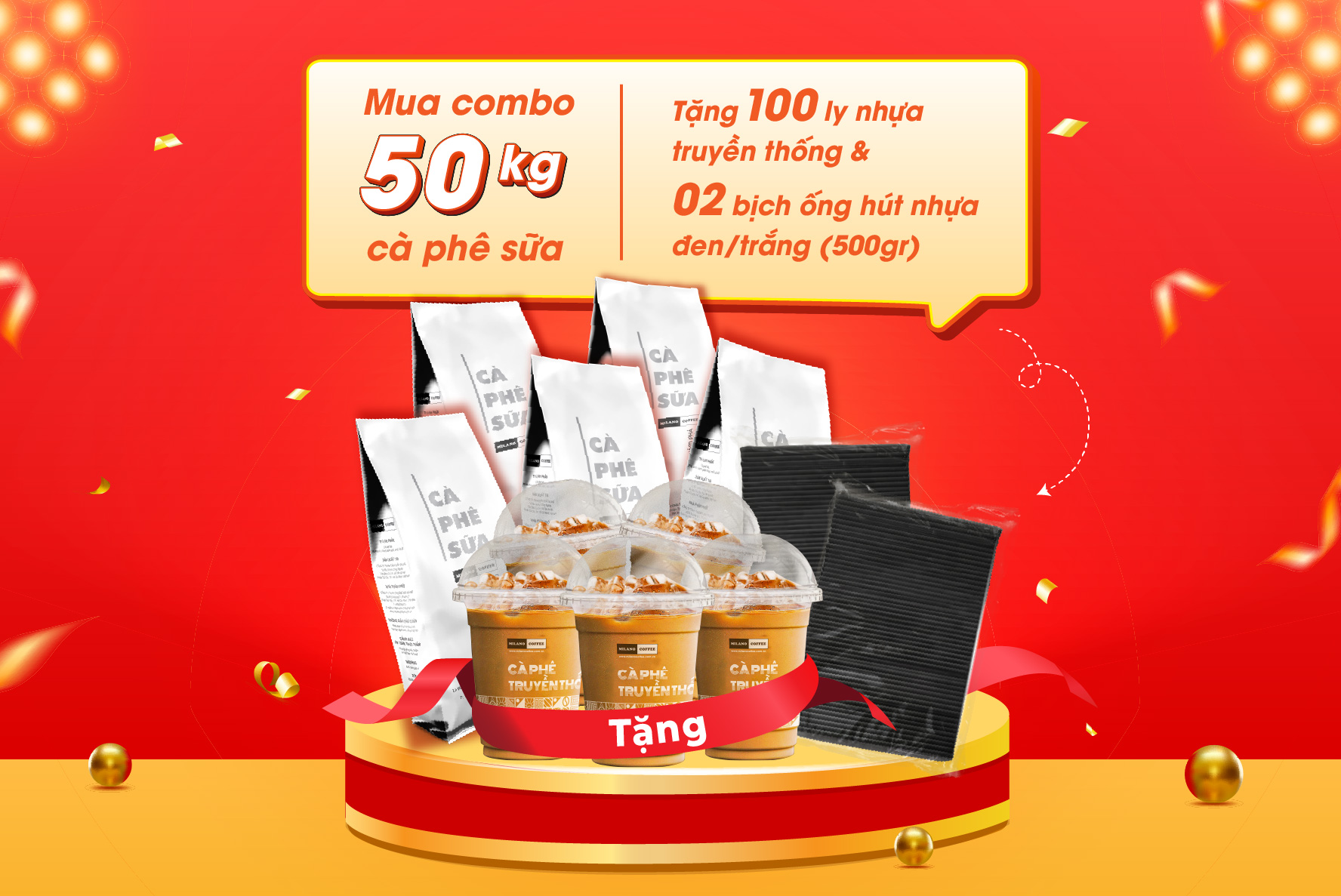 Quý Đại lý vẫn có thể săn ưu đãi với combo 50kg cà phê sữa tặng 100 ly nhựa in 400ml (có nắp) và 02 bịch ống hút nhựa đen/trắng (loại 500gr).