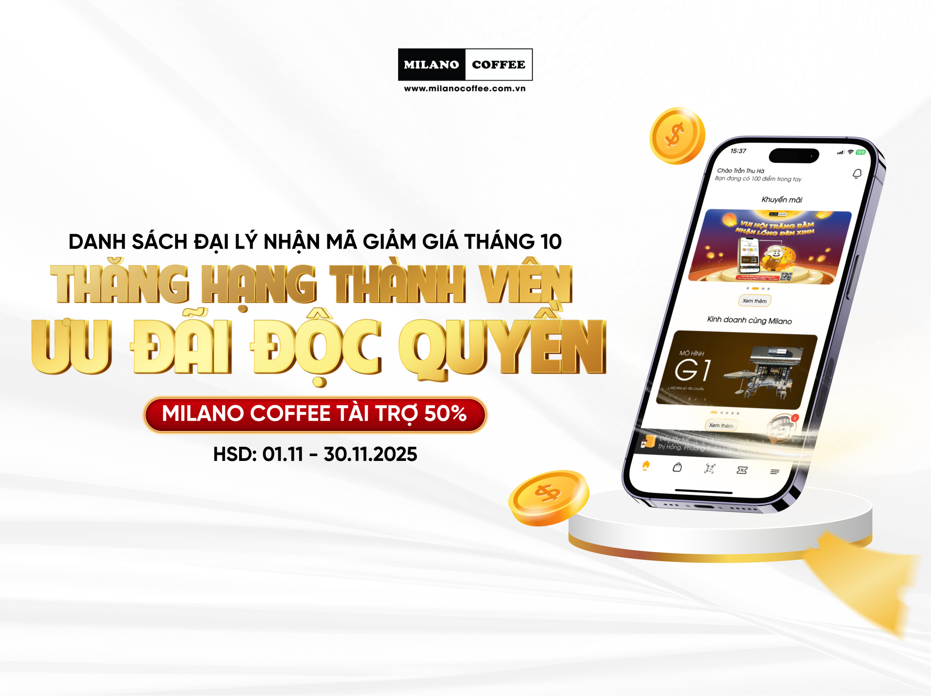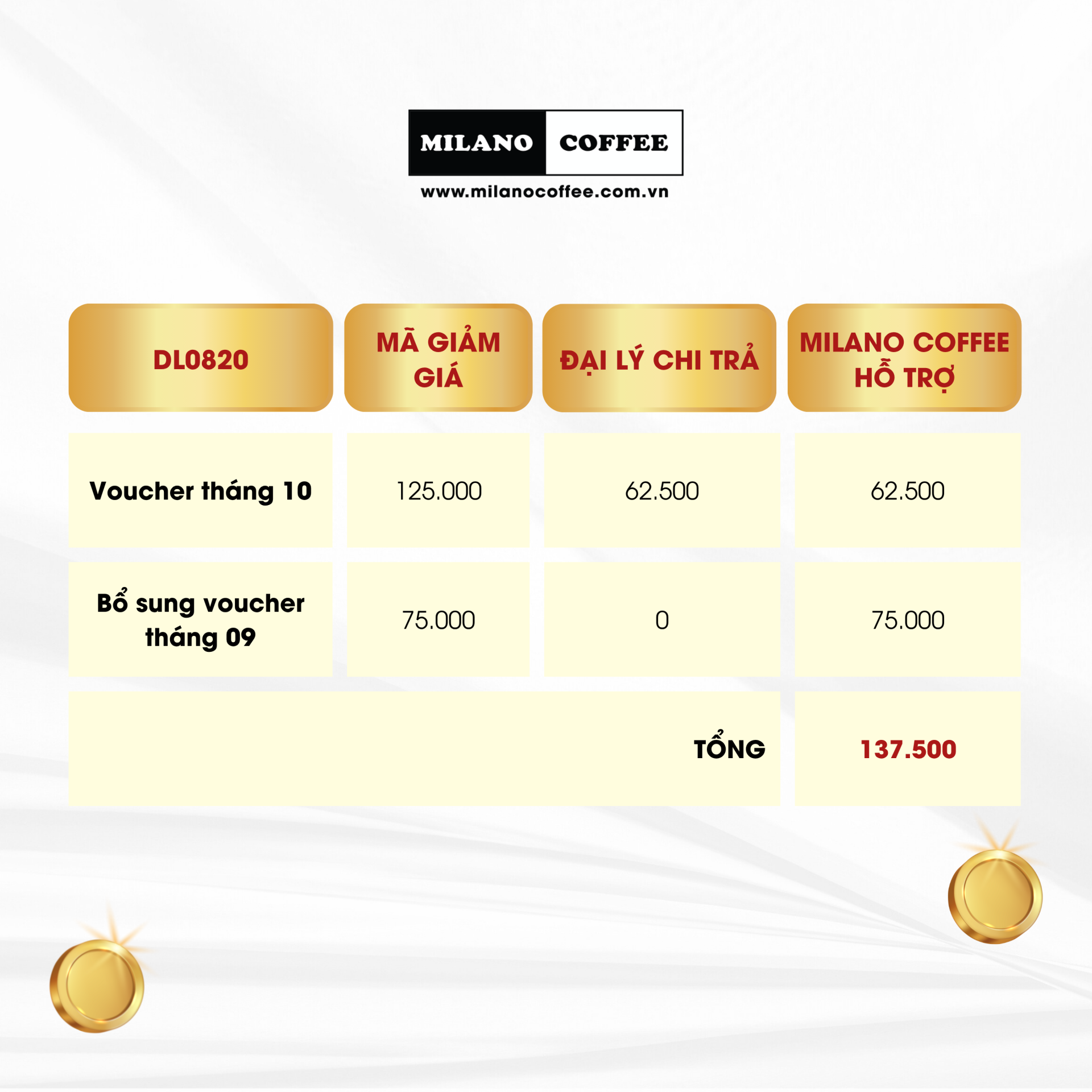 Milano Coffee thông báo danh sách Đại lý nhận mã voucher giảm giá chương trình đồng tài trợ “THĂNG HẠNG THÀNH VIÊN – ƯU ĐÃI ĐẶC QUYỀN” trên ứng dụng Milano Coffee - Tích điểm, kết quả xét hạng đến hết ngày 30.10.2025.