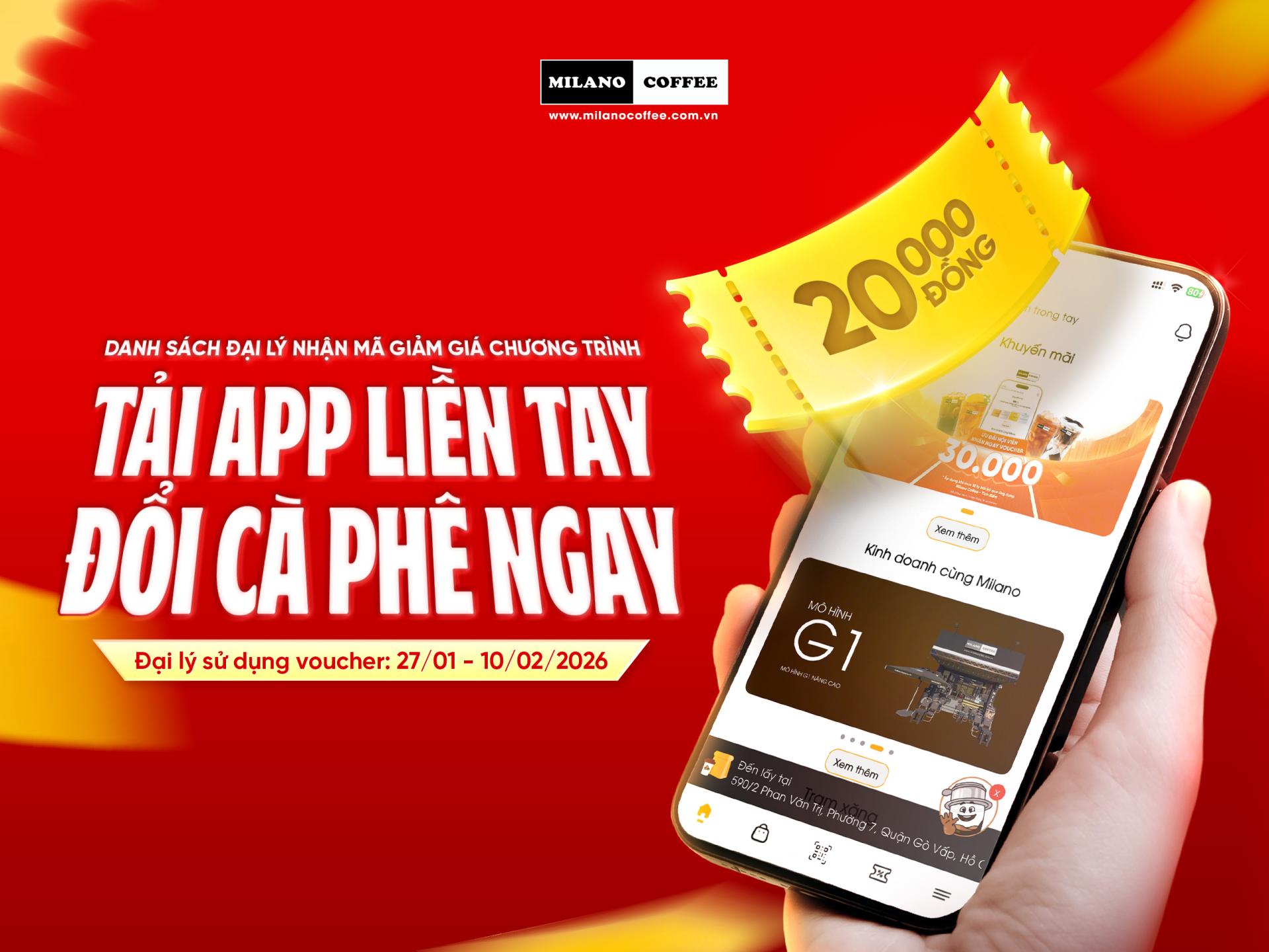 Milano Coffee thông báo danh sách Đại lý nhận mã giảm giá chương trình “Tải APP liền tay - Đổi ngay thức uống” trên ứng dụng Milano Coffee - Tích điểm.