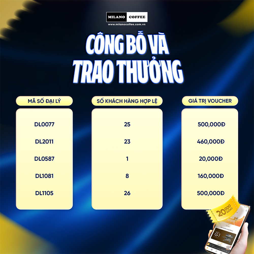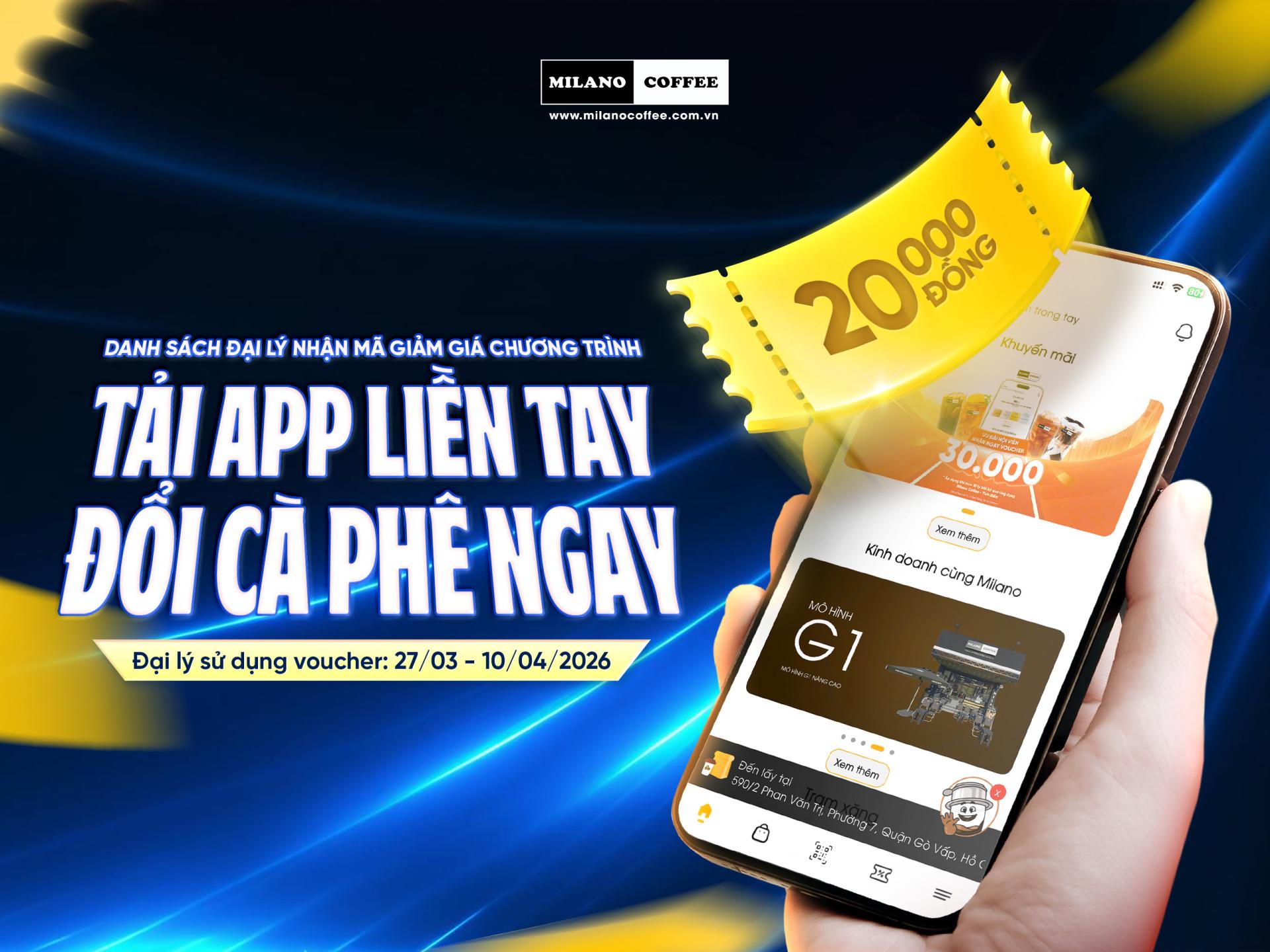 Milano Coffee thông báo danh sách Đại lý nhận mã giảm giá chương trình “Tải APP liền tay - Đổi cà phê ngay” trên ứng dụng Milano Coffee - Tích điểm.