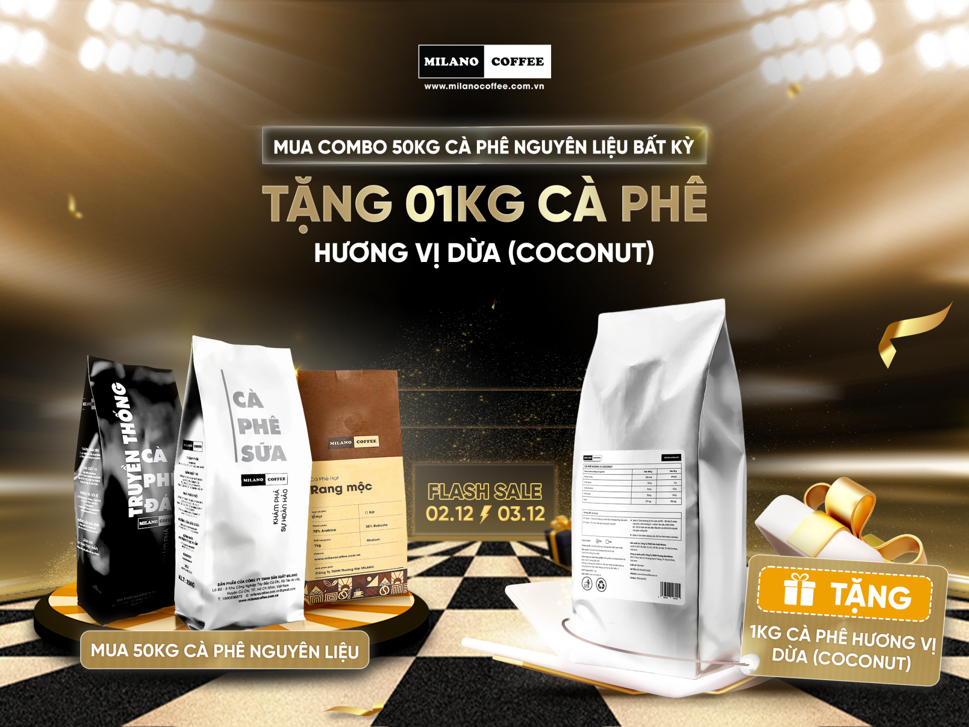 Từ 14h ngày 02/12 - 03/12/2025, Milano Coffee triển khai chương trình Flash sale: Mua combo 50kg cà phê nguyên liệu bất kỳ tặng ngay 01kg cà phê hương vị dừa (coconut).