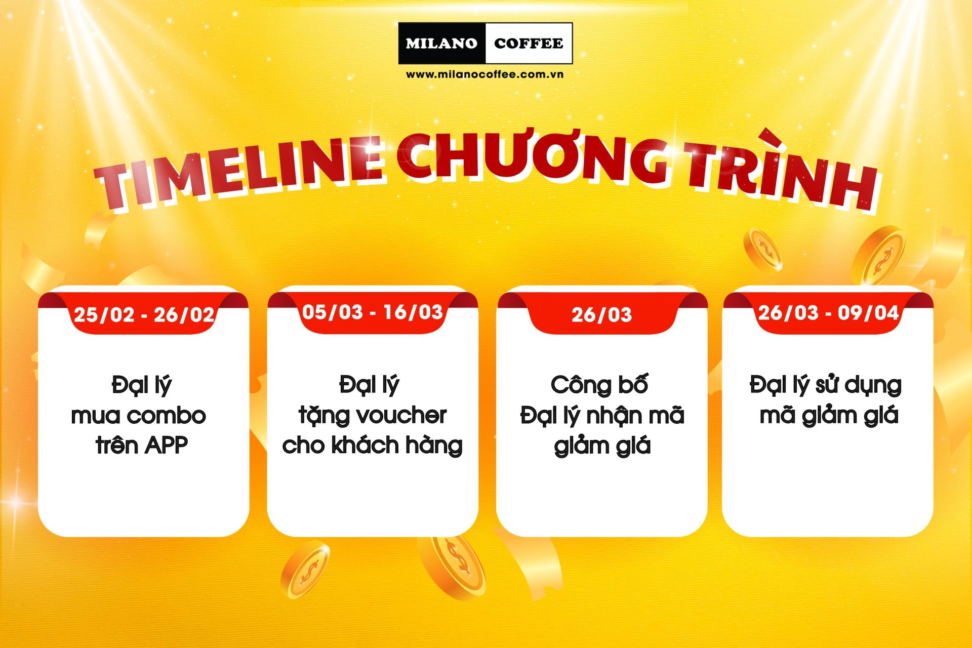 - Từ ngày 05/03 đến hết ngày 16/03/2025: Đại lý triển khai chương trình tặng voucher khi đặt hàng tại cửa hàng trên ứng dụng Milano Coffee - Tích điểm.