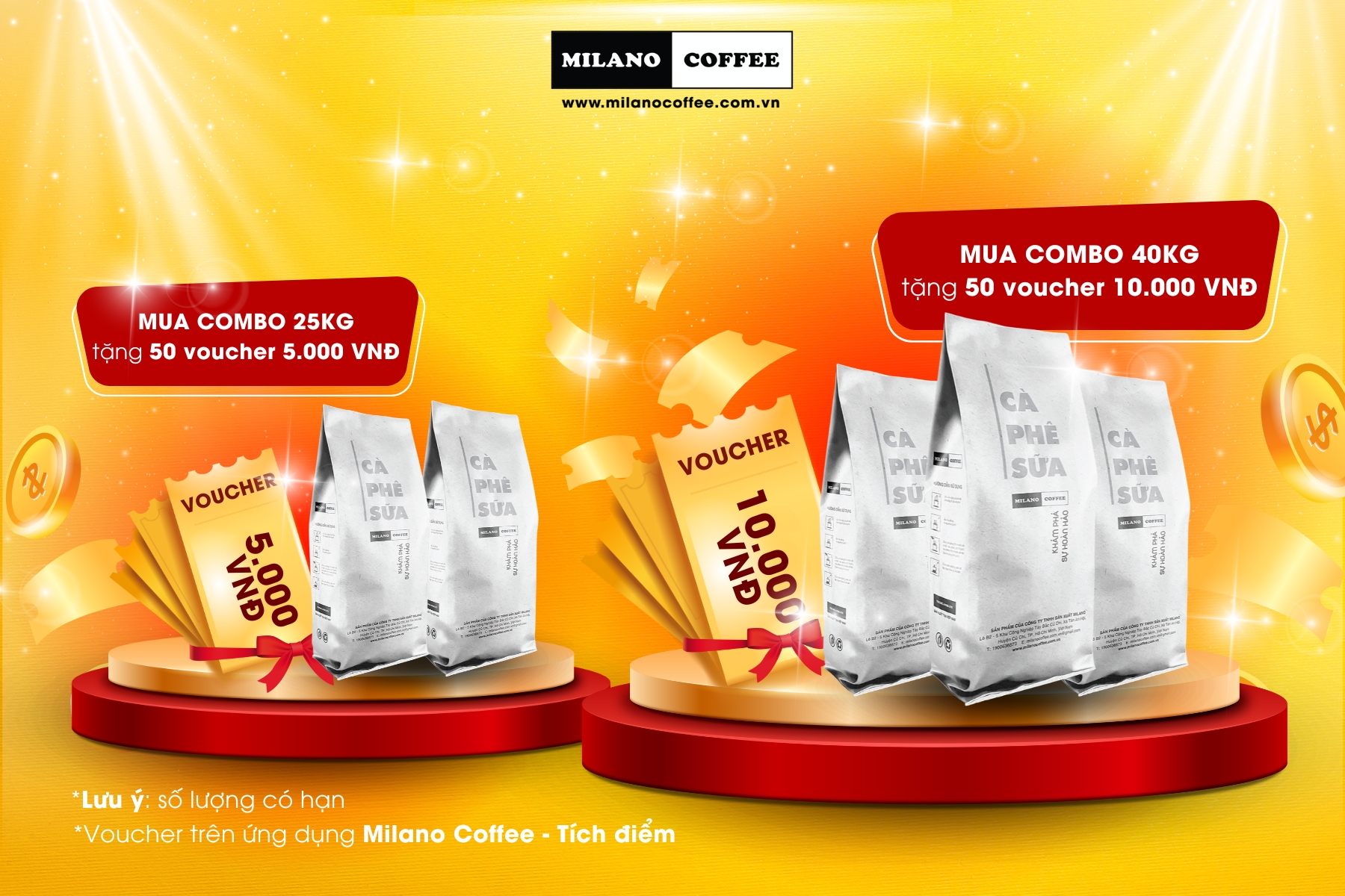 50 combo 40kg cà phê sữa tặng 50 voucher 10.000 VNĐ.