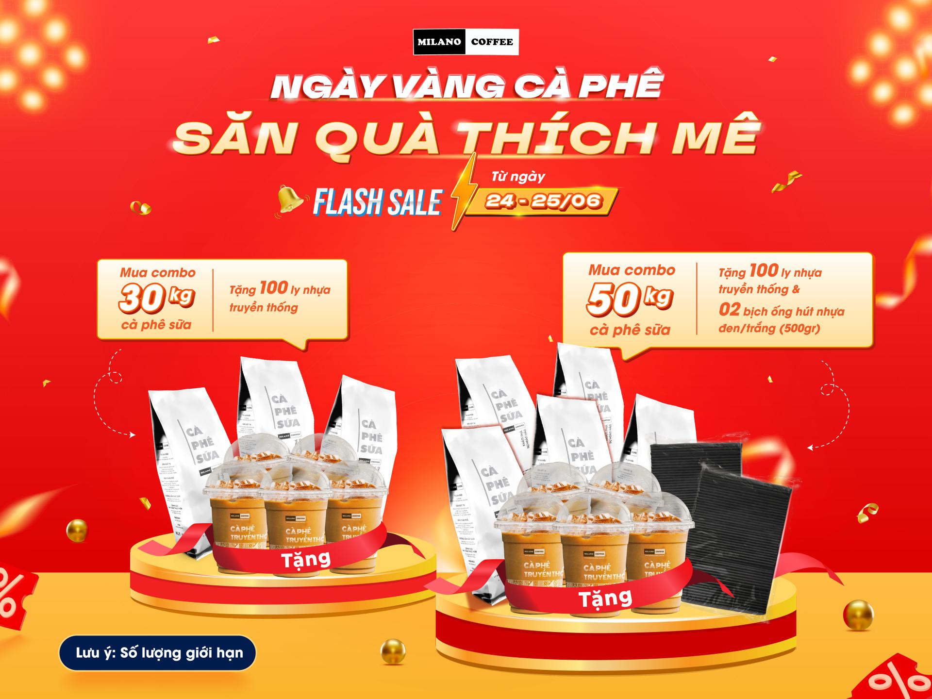 Ngày 24/06 và 25/06/2024, Milano Coffee triển khai chương trình Flash Sale: Mua combo 30kg cà phê sữa tặng 100 ly nhựa in 400ml (có nắp), mua combo 50kg cà phê sữa tặng 100 ly nhựa in 400ml (có nắp) và 02 bịch ống hút nhựa đen/trắng (500gr).