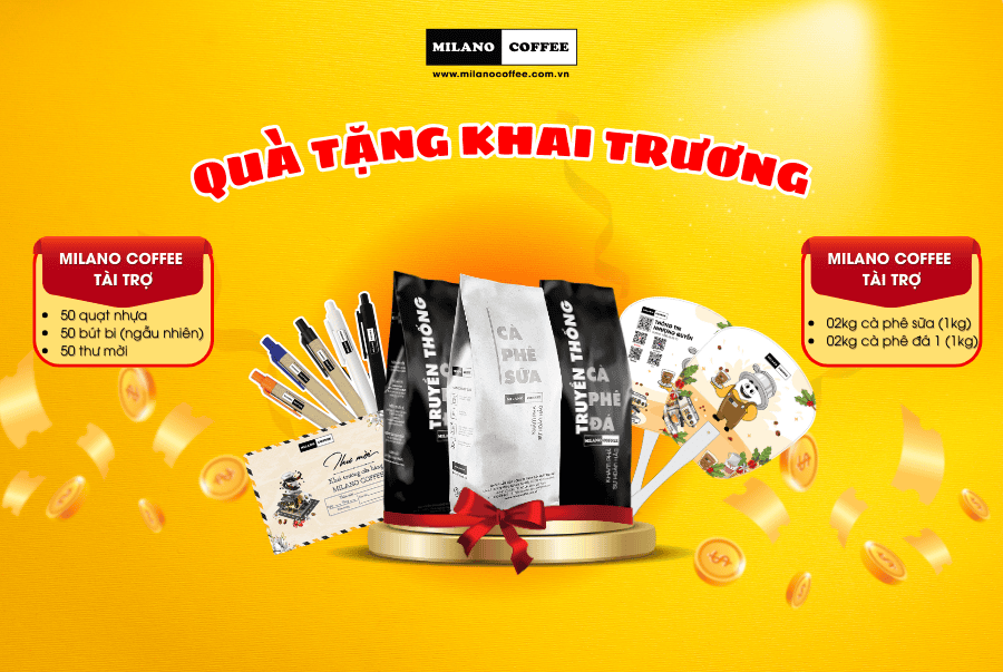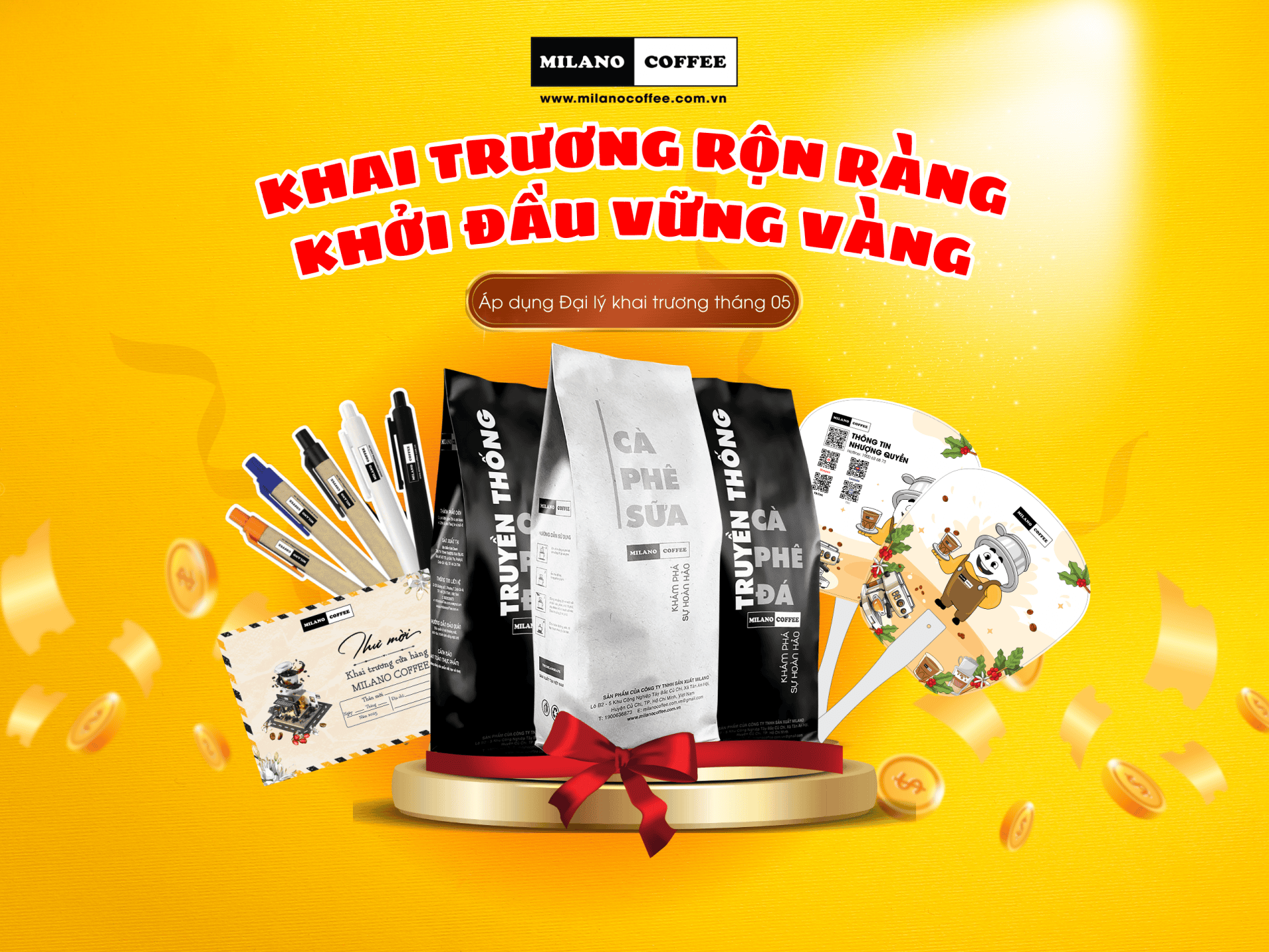 Các Đại lý khai trương trong tháng 05 sẽ nhận được 01 combo quà tặng đặc biệt từ Milano Coffee, bao gồm: