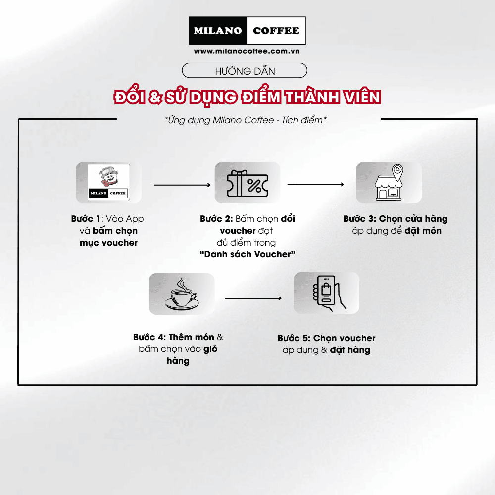- Từ ngày 15/07 - 31/12: Khách hàng đặt hàng, tích điểm và đổi điểm trên ứng dụng MilanoCoffee - Tích điểm.