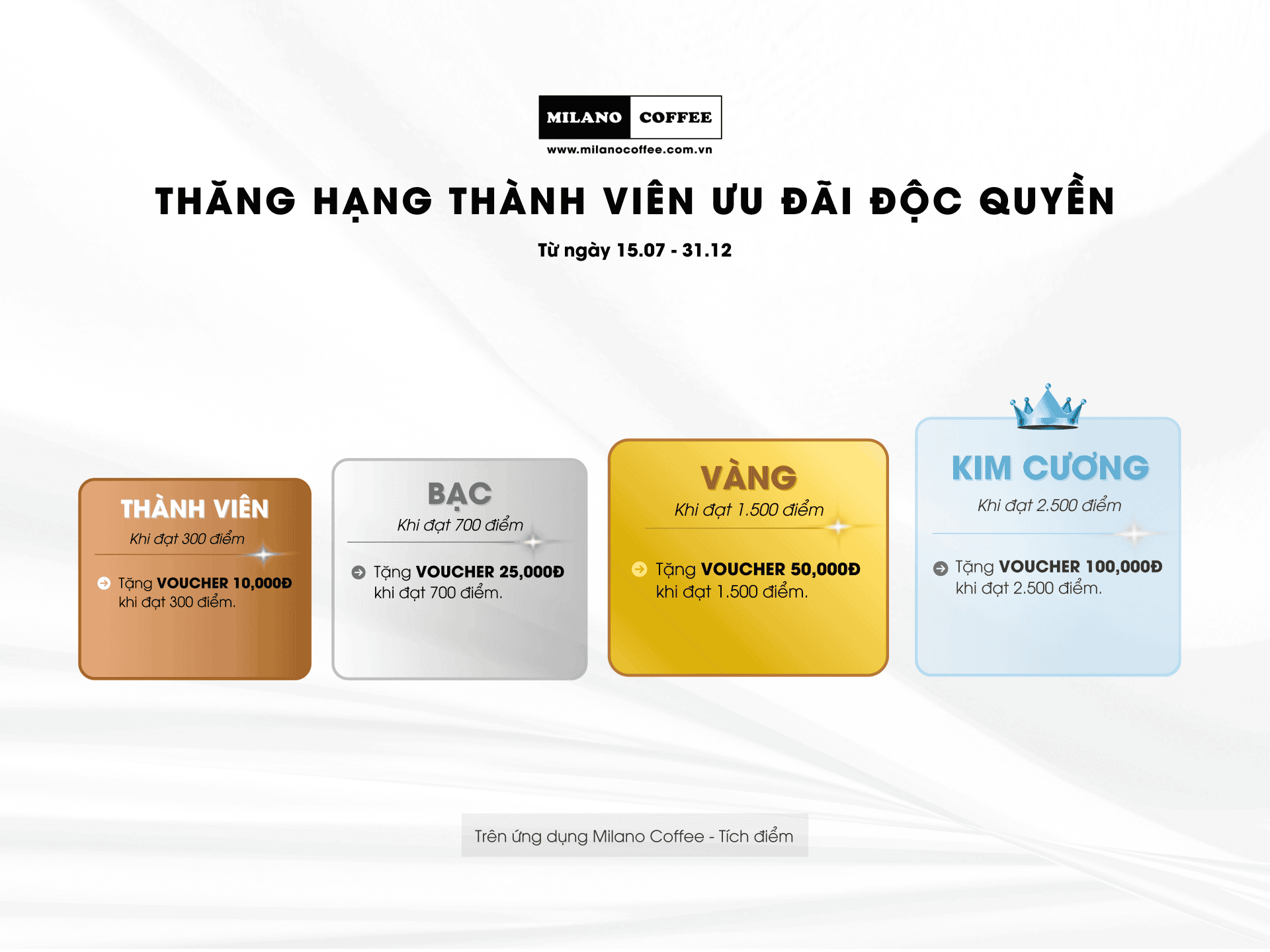 Từ ngày 15/07 đến 31/12/2025, Milano Coffee triển khai chương trình: THĂNG HẠNG THÀNH VIÊN – ƯU ĐÃI ĐẶC QUYỀN trên ứng dụng Milano Coffee - Tích điểm.