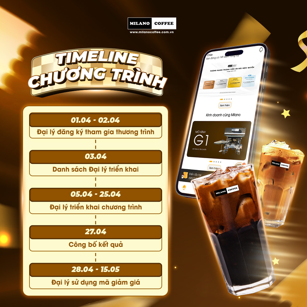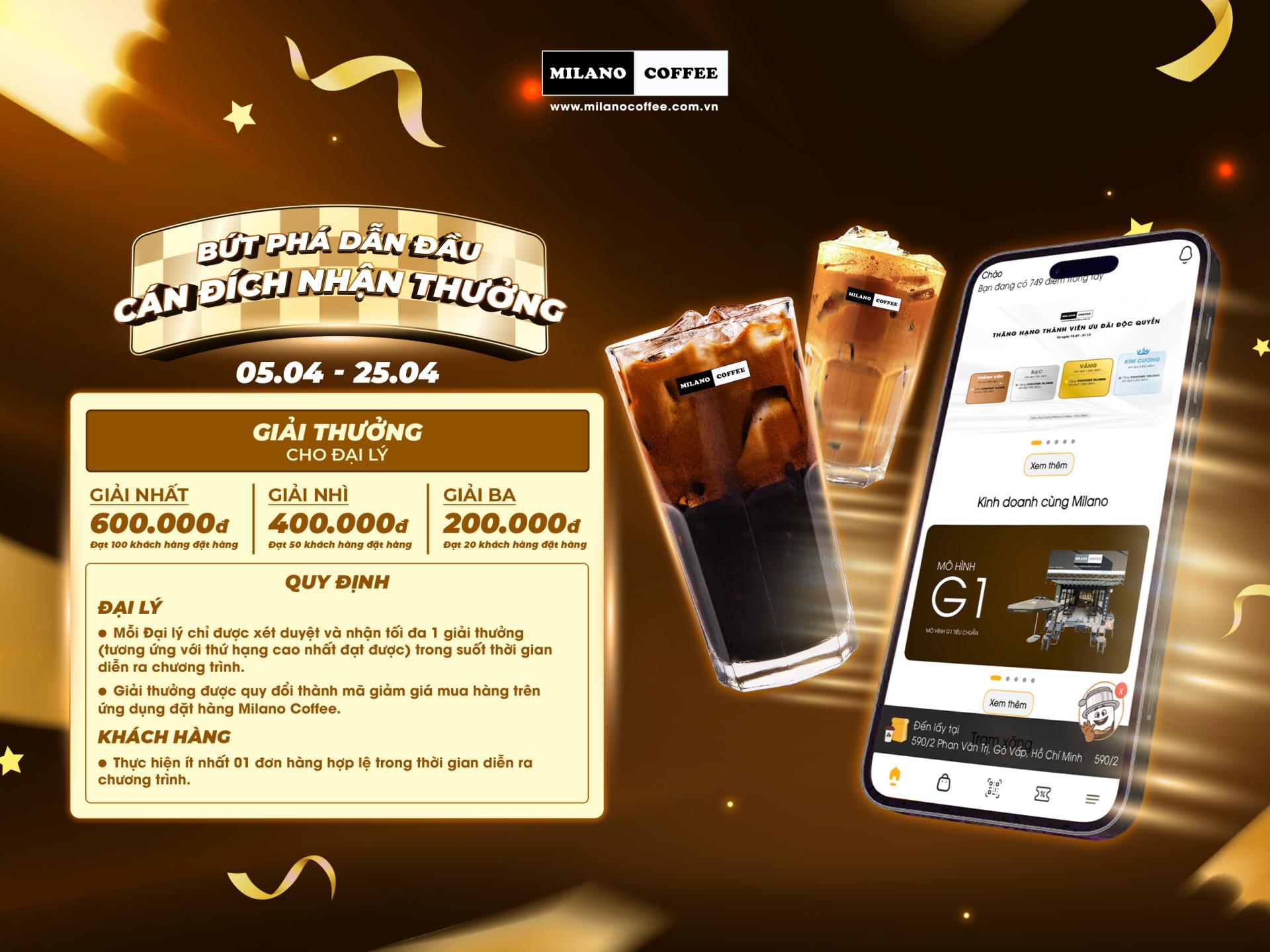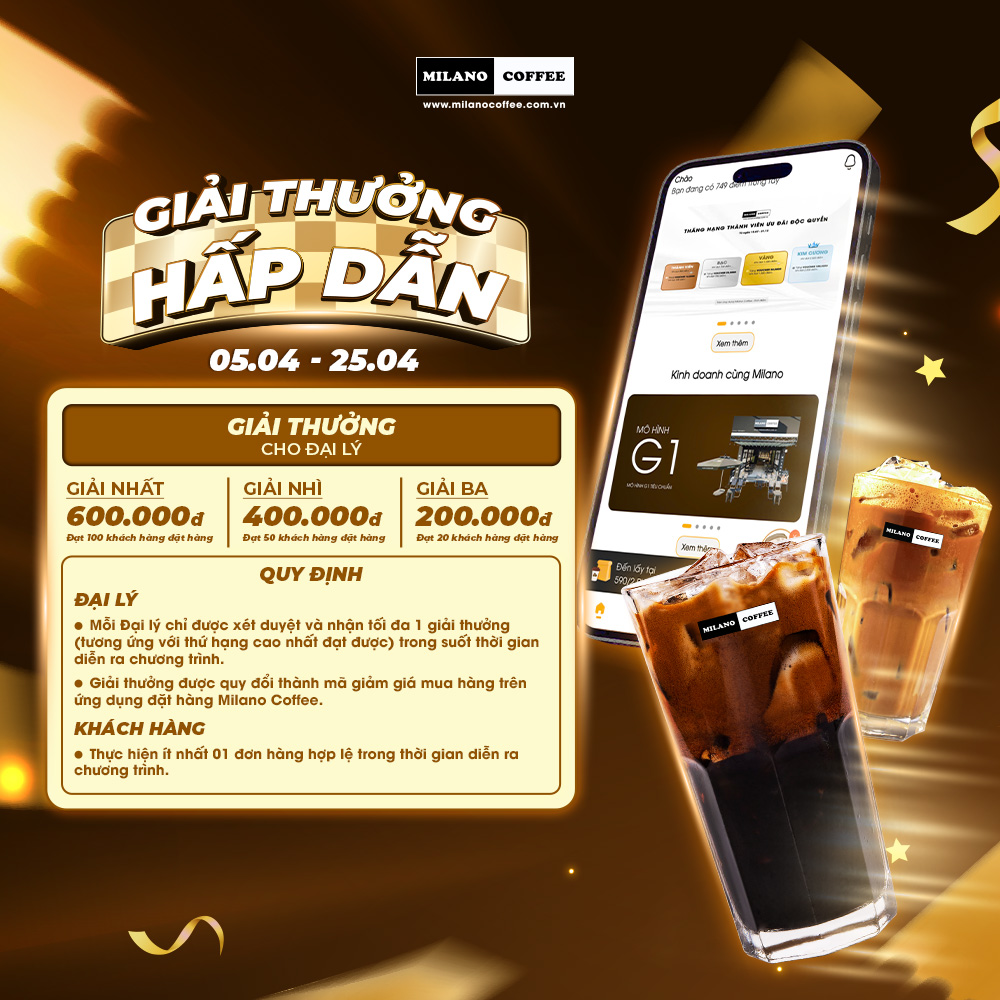 - Điều kiện xét thưởng: Milano Coffee ghi nhận Đại lý đạt số lượng khách hàng đặt hàng theo mốc giải thưởng của chương trình: