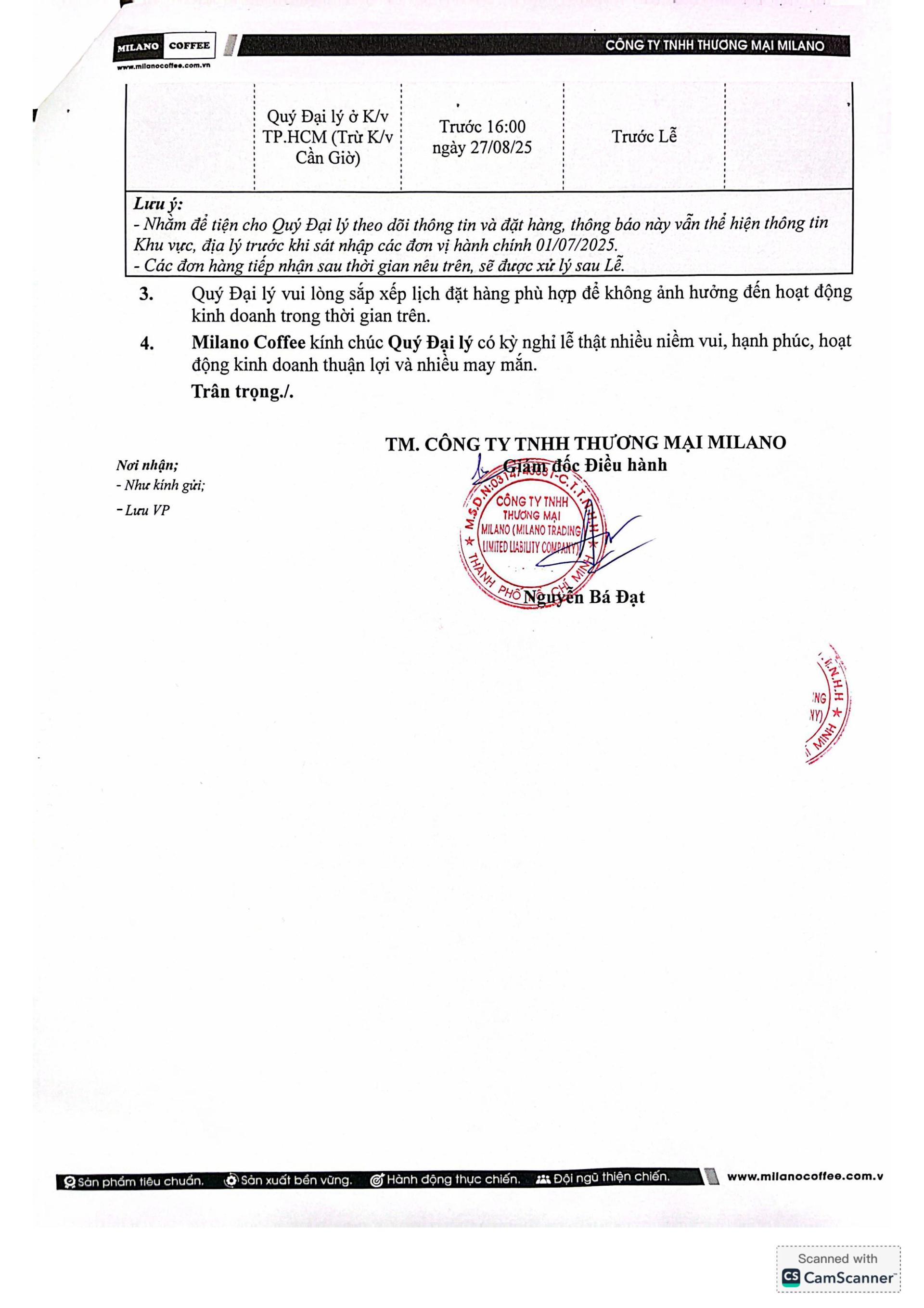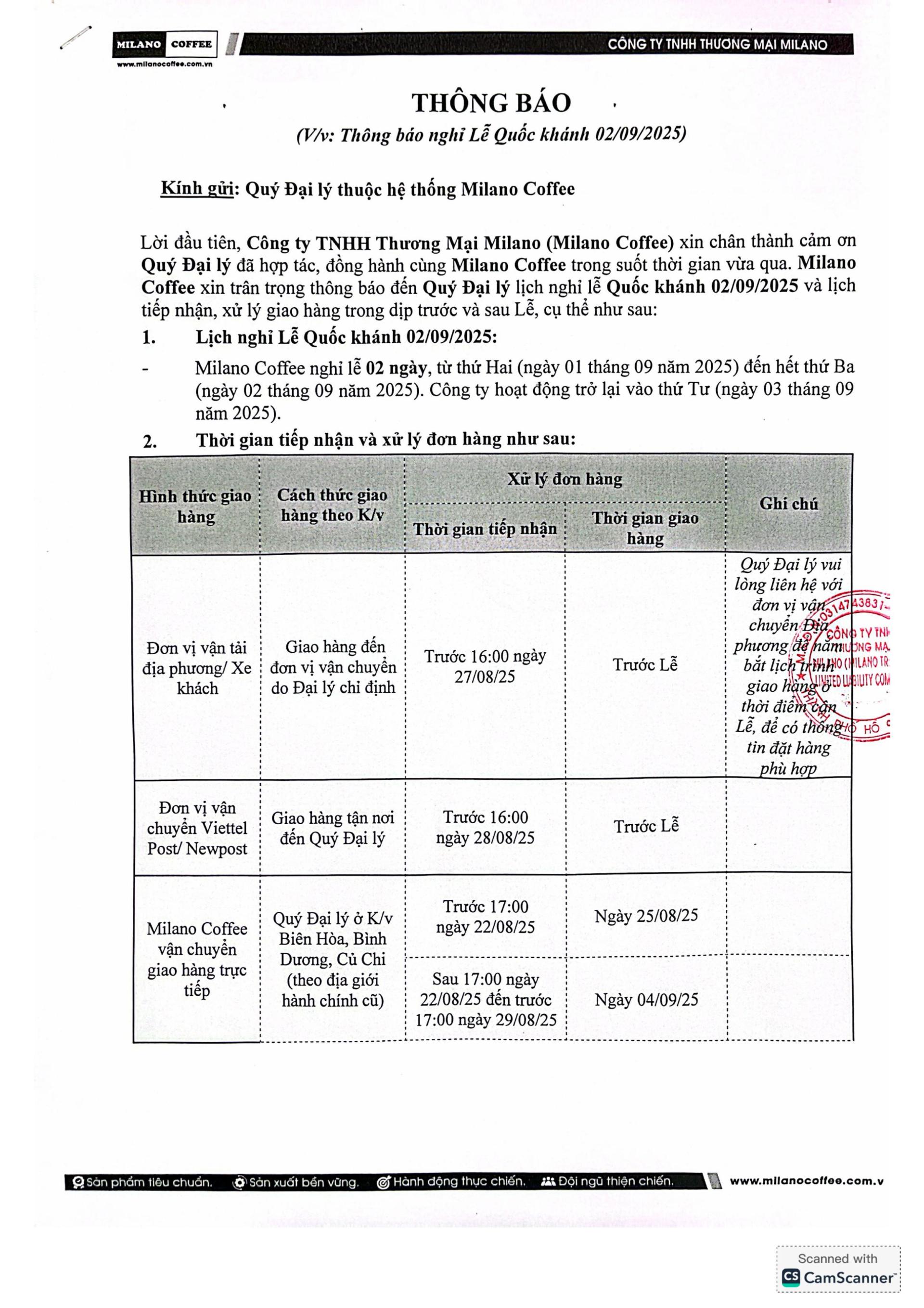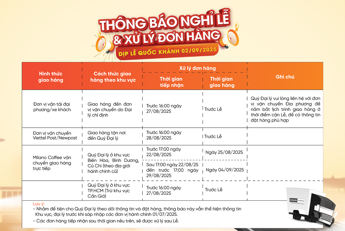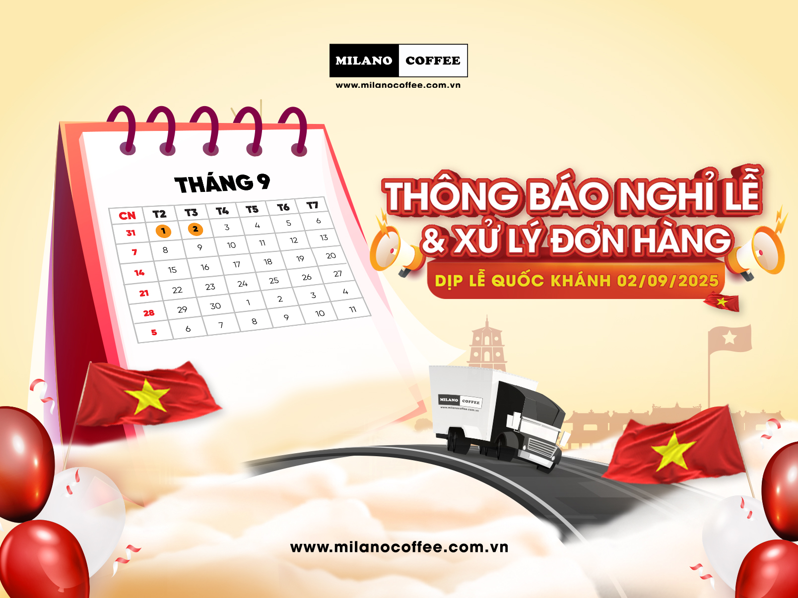 Lời đầu tiên, Công ty TNHH Thương Mại Milano (Milano Coffee) xin chân thành cảm ơn Quý Đại lý đã hợp tác, đồng hành cùng Milano Coffee trong suốt thời gian vừa qua. Milano Coffee xin trân trọng thông báo đến Quý Đại lý lịch nghỉ lễ Quốc khánh 02/09/2025 và lịch tiếp nhận, xử lý giao hàng trong dịp trước và sau Lễ, cụ thể như sau: