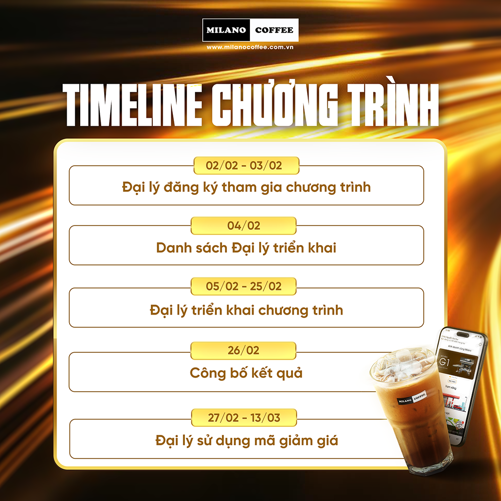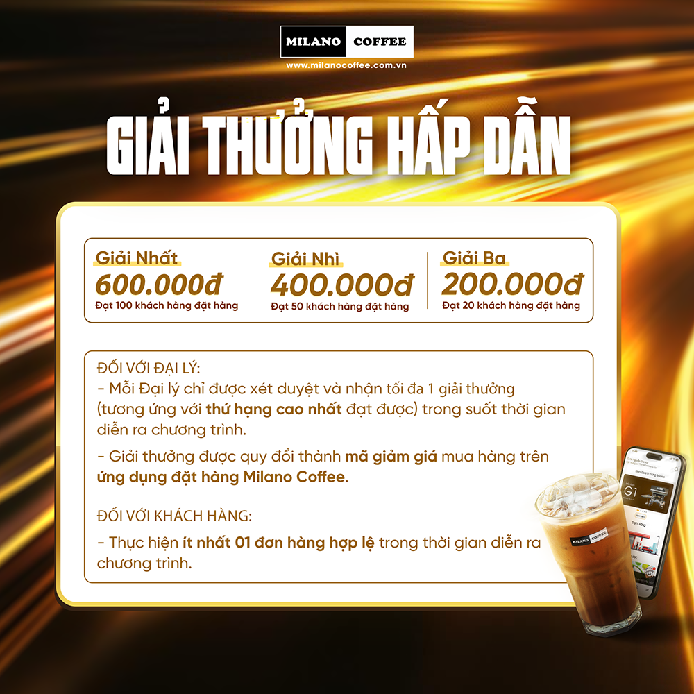 - Điều kiện xét thưởng: Milano Coffee ghi nhận Đại lý đạt số lượng khách hàng đặt hàng theo mốc giải thưởng của chương trình: