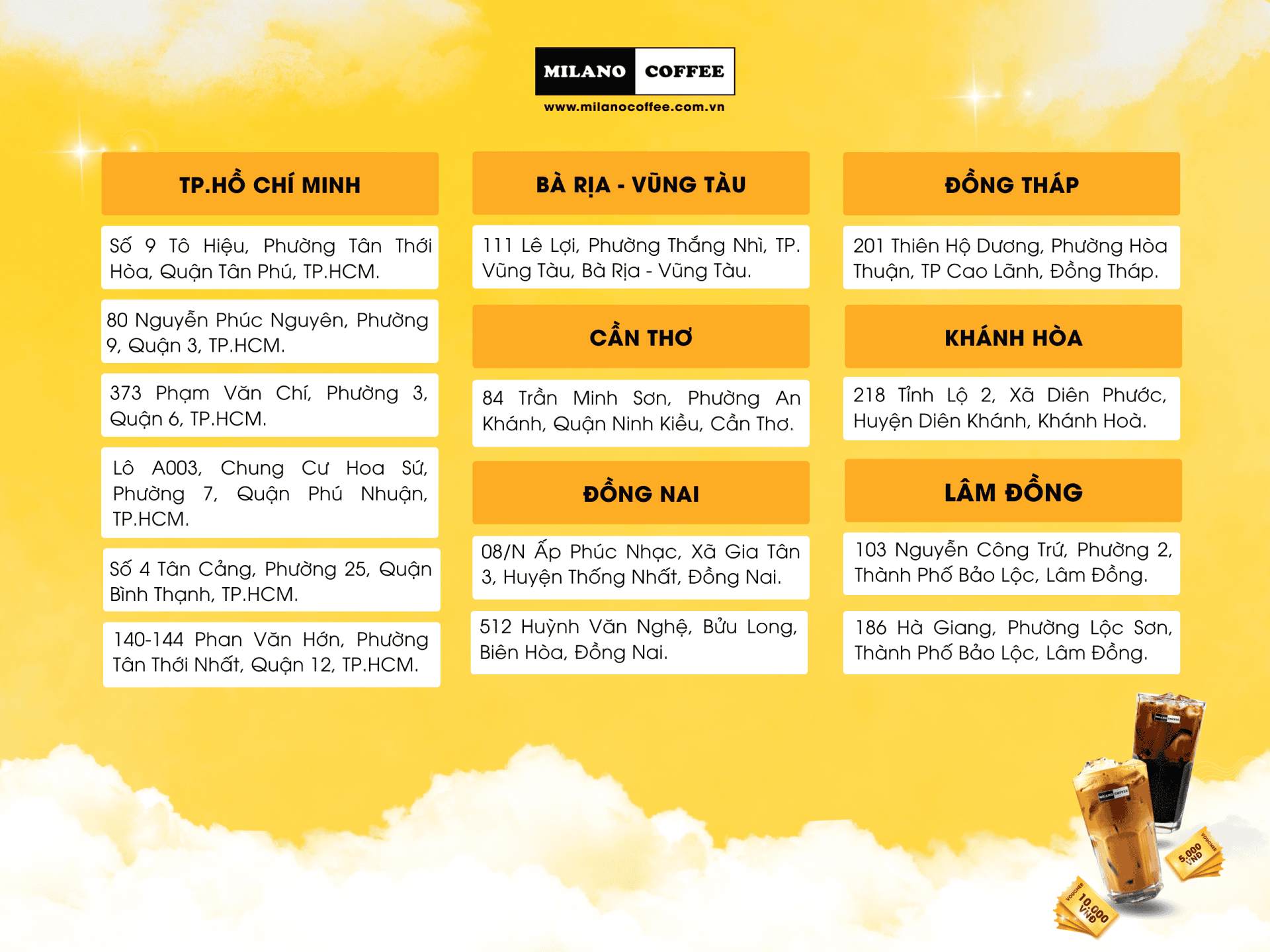 Do đó, Milano Coffee công bố danh sách Đại lý đủ điều kiện triển khai chương trình tặng voucher cho khách hàng trên ứng dụng Milano Coffee - Tích điểm.