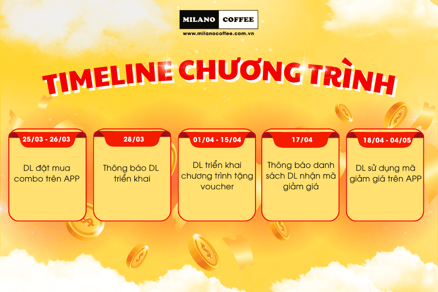- Từ ngày 01/04 đến hết ngày 15/04/2025: Đại lý triển khai chương trình tặng voucher khi đặt hàng tại cửa hàng trên ứng dụng Milano Coffee - Tích điểm.