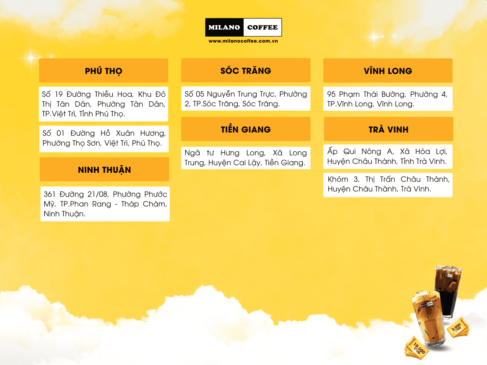 - Ngày 17/04/2025: Milano Coffee công bố danh sách Đại lý nhận mã giảm giá ứng với số lượng các hóa đơn của khách hàng sử dụng trên ứng dụng Milano Coffee - Tích điểm.